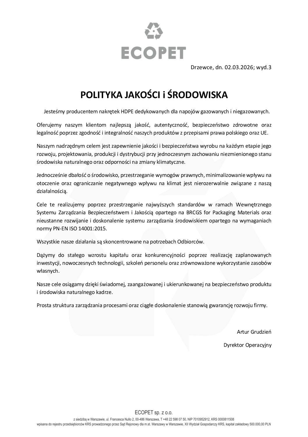 Naszą misją jest tworzenie produktów o najwyższej jakości, a także profesjonalna obsługa Klientów, trafne wyczucie ich potrzeb, pomoc w rozwiązywaniu problemów oraz zapewnienie bezpieczeństwa zdrowotnego. Ciągłe doskonalenie Wewnętrznego Systemu Zarządzania Jakością, dbałość o środowisko oraz innowacyjność pozwalają na spełnienie oczekiwań naszych Obiorców. Niezastąpionym ogniwem firmy są Pracownicy, dlatego dbanie o ich rozwój, ciągła motywacja oraz zapewnienie komfortu pracy są naszym priorytetem. W oparciu o nowoczesne technologie oraz kreatywność naszego zespołu dążymy do osiągnięcia ugruntowanej pozycji na rynku opakowań.